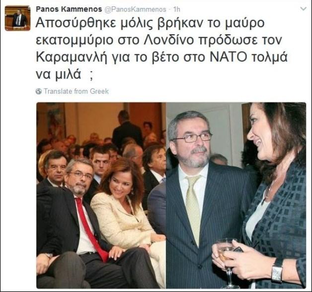 «Αποσύρθηκε μόλις βρήκαν το μαύρο εκατομμύριο στο Λονδίνο πρόδωσε τον Καραμανλή για το βέτο στο ΝΑΤΟ, τολμά να μιλά;», έγραψε στον λογαριασμό του στο Twitter.
