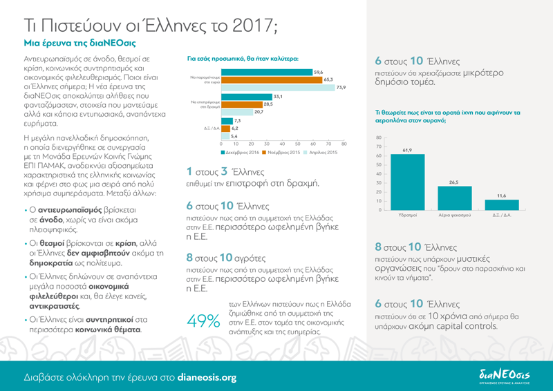 Ένα άλλο μέρος των ευρημάτων της έρευνας παρουσιάζει το πορτραίτο μιας κοινωνίας κλειστής, φοβικής προς τον κόσμο και την αλλαγή, εθισμένης σε ανεδαφικές θεωρίες που δεν αντέχουν στην επαφή με την πραγματικότητα. Ο ευρωσκεπτικισμός εξακολουθεί να κερδίζει έδαφος, με την πεποίθηση να παγιώνεται ότι η Ελλάδα δεν έχει ωφεληθεί ιδιαιτέρως από τη συμμετοχή της στην ευρωπαϊκή κοινότητα.