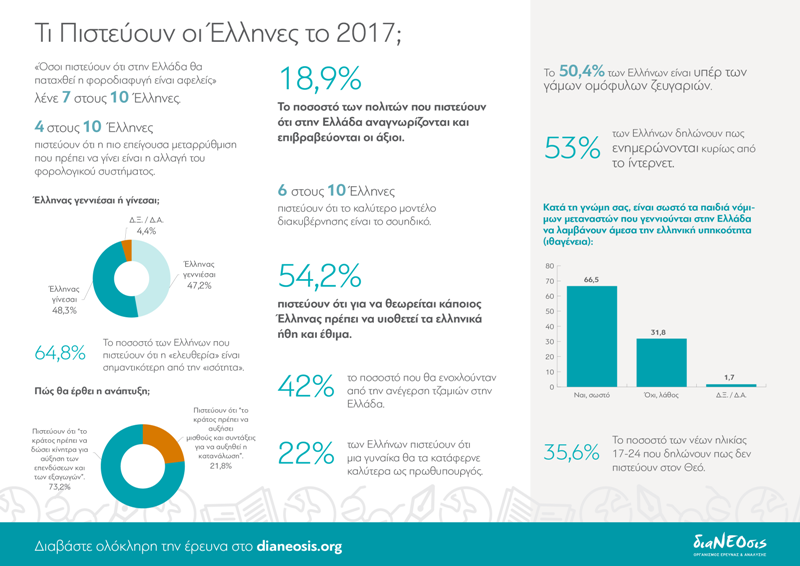 Μια επιφανειακά αντιφατική εικόνα,  που όμως δείχνει πιο εσωτερικά συνεπής όσο βαθύτερα εξετάζεται, προκύπτει από την Τρίτη έκδοση της έρευνας “Τι πιστεύουν οι Έλληνες”, του ερευνητικού οργανισμού “διαΝΕΟσις”, την οποία παρουσιάζει η “Καθημερινή της Κυριακής”.