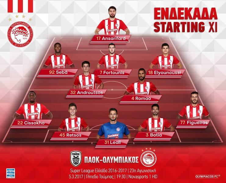 Κίπερ ο Λεάλι, δεξί μπακ ο Φιγκέϊρας, Μποτία και Ρέτσος οι στόπερ και αρ. μπακ ο Σισοκό. Ο Ρομαό αμυντικός χαφ, ο Ανδρούτσος πιο μπροστά του στο κέντρο και όχι ο Μάρτινς, Φορτούνης επιτελικός, Σεμπά και Ελιουνούσι οι ακραίοι και φορ ο Ανσαριφάρντ.