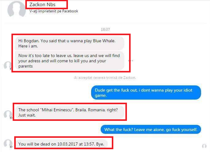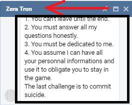 Μετά από αυτό, το πιο λογικό είναι να τον κάνει add ένας από τους δημιουργούς του παιχνιδιού. Θα στείλει τους κανόνες στο θύμα του, λέγοντας πράγματα όπως «θα κάνεις ότι σου λέω», «δεν θα μπορείς να βγεις από το παιχνίδι», «αν βγεις έχουμε τα στοιχεία σου», και ότι το τελευταίο βήμα είναι η αυτοκτονία. Πρόκειται για εγκληματική πράξη. Μέχρι τώρα, έχουν καταγραφεί περισσότεροι από 300 θάνατοι παιδιών από αυτό το παιχνίδι. Τα θύματα τους είναι μικρά παιδιά που δεν ξεπερνάνε τα 16 ( ηλικίες 12-16 ετών ). Ήρθε η ώρα να σταματήσουμε όλο αυτό που γίνεται. Οι Anonymous έχουν βρει τους υπεύθυνους!