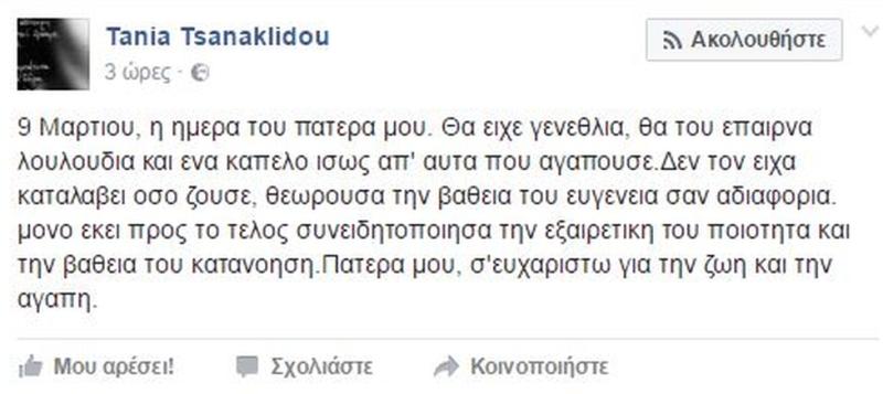 Σήμερα, λοιπόν, 9 Μάρτίου, που ο πατέρας της θα είχε γενέθλια, η Τάνια Τσανακλίδου έγραψε στο Facebook: «9 Μαρτιου, η ημέρα του πατερά μου. Θα είχε γενέθλια, θα του έπαιρνα λουλούδια και ένα καπέλο ίσως απ’ αυτά που αγαπούσε. Δεν τον είχα καταλάβει όσο ζούσε, θεωρούσα την βαθειά του ευγένεια σαν αδιαφορία. Μονό εκεί προς το τέλος συνειδητοποίησα την εξαιρετική του ποιότητα και την βαθειά του κατανόηση. Πατερά μου, ευχαριστώ για την ζωή και την αγάπη».