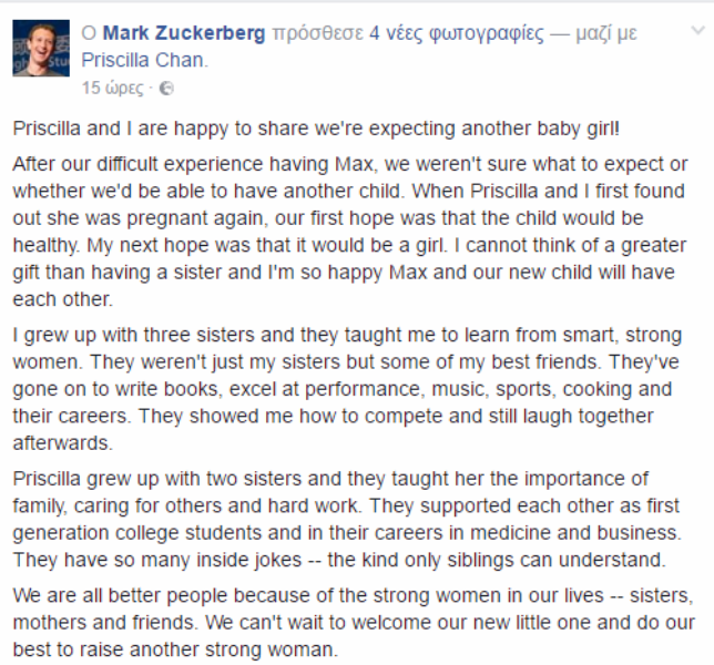 Ο λόγος για τον Μαρκ Ζάκερμπεργκ και τη σύζυγό του που, πλέον, ανυπομονούν να κρατήσουν στην αγκαλιά τους το δεύτερο μωρό τους. Μάλιστα, ο ιδρυτής του Facebook θέλησε να μοιραστεί τα ευχάριστα νέα με τους διαδικτυακούς του φίλους.