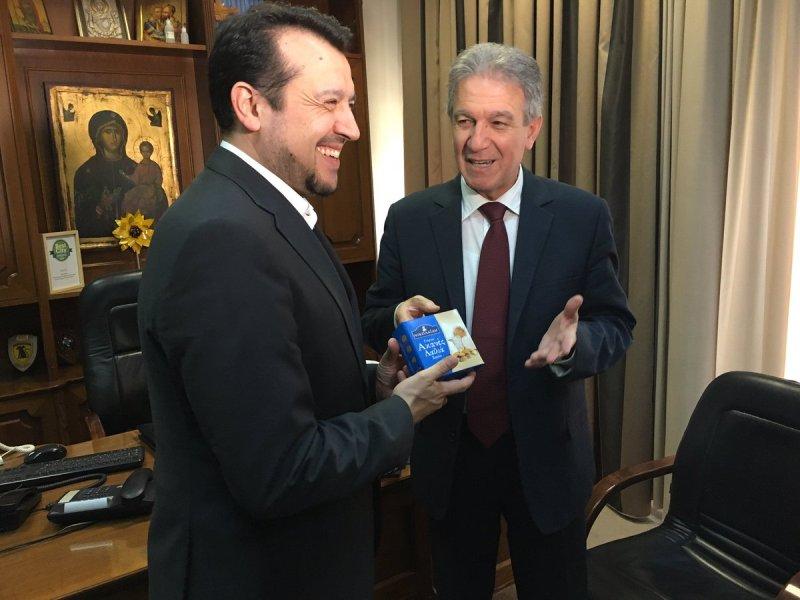 Ο Νίκος Παππάς συναντήθηκε με τον δήμαρχο Σερρών, Πέτρο Αγγελίδη ο οποίος και τον κέρασε το παραδοσιακό γλυκό των Σερρών, τον ακανέ.