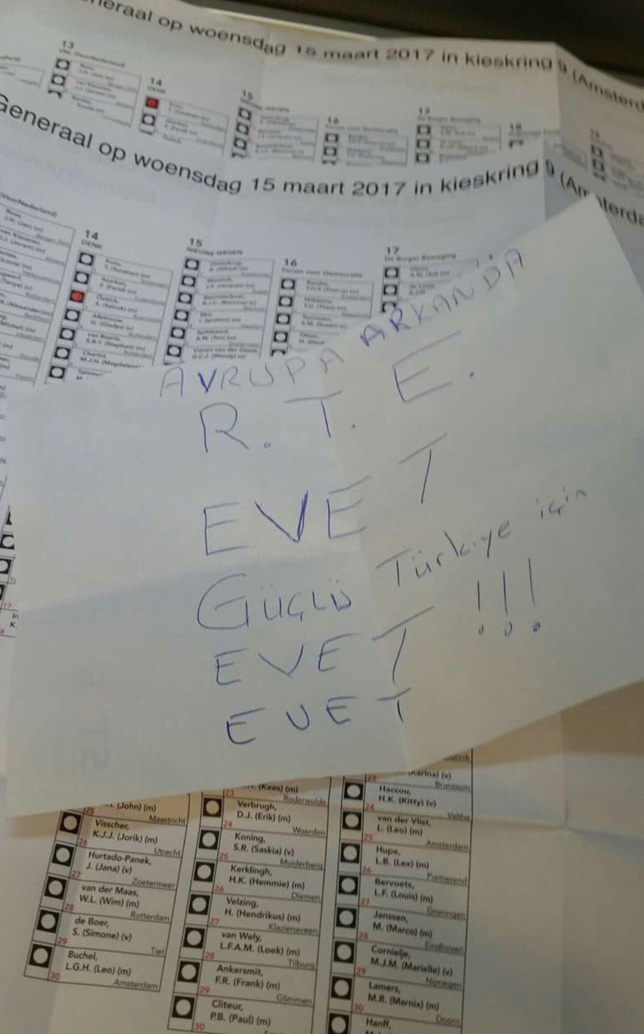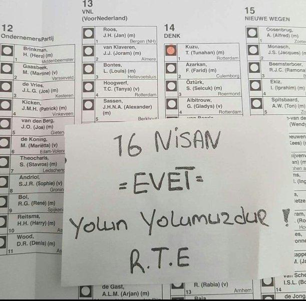 «Από την Ευρώπη ψηφίζουμε RTE [σ.σ. τα αρχικά του ονόματος του Ερντογάν] για μια δυνατή Τουρκία λέμε ναι, ναι » έγγραψε μια καρτέλα που προστέθηκε πάνω από ψηφοδέλτιο σε μια άλλη φωτογραφία.