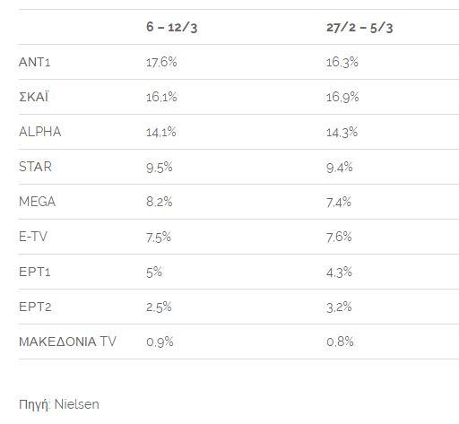 Μικρή αύξηση είχε η θεαματικότητα της ΕΡΤ1, αλλά εμφανίζεται ισόποσα μειωμένη η τηλεθέαση της ΕΡΤ2.