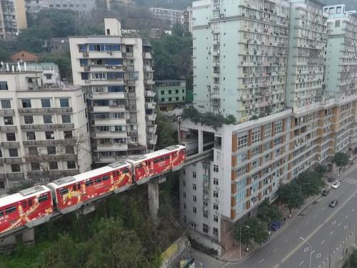 Μια γραμμή του μετρό που περνάει μέσα από κτίριο στην περιοχή Τσονγκίνγκ, στην Κίνα. Απ’ ότι φαίνεται οι αρχιτέκτονες αποφάσισαν να μην κατεδαφίσουν τα κτίρια από τα οποία περνάει η γραμμή, διευκολύνοντας τους κατοίκους τους αφού δημιούργησαν και στάσεις στο εσωτερικό τους.