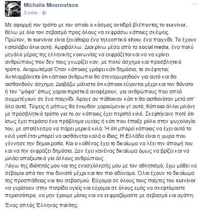 «Με αφορμή τον τρόπο με τον οποίο ο κόσμος αντιδρά βλέποντας το survivor, θέλω με όλο τον σεβασμό προς όλους να εκφράσω κάποιες σκέψεις.