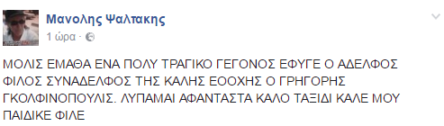 «ΜΟΛΙΣ ΕΜΑΘΑ ΕΝΑ ΠΟΛΥ ΤΡΑΓΙΚΟ ΓΕΓΟΝΟΣ ΕΦΥΓΕ Ο ΑΔΕΛΦΟΣ ΦΙΛΟΣ ΣΥΝΑΔΕΛΦΟΣ ΤΗΣ ΚΑΛΗΣ ΕΠΟΧΗΣ Ο ΓΡΗΓΟΡΗΣ ΓΚΟΛΦΙΝΟΠΟΥΛΟΣ. ΛΥΠΑΜΑΙ ΑΦΑΝΤΑΣΤΑ ΚΑΛΟ ΤΑΞΙΔΙ ΚΑΛΕ ΜΟΥ ΠΑΙΔΙΚΕ ΦΙΛΕ» , έγραψε στην ανάρτησή του.
