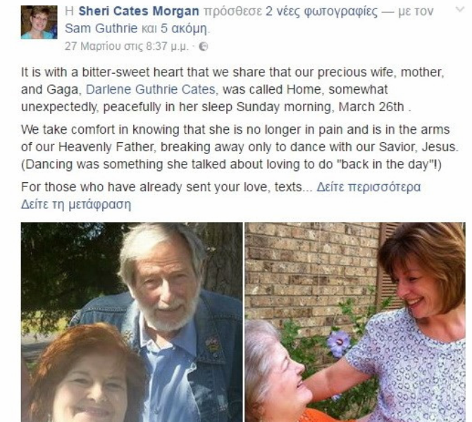 Η ηθοποιός ήταν 69 χρόνων και η είδηση του θανάτου της σκόρπισε θλίψη στον καλλιτεχνικό χώρο. Το θλιβερό γεγονός γνωστοποίησε η κόρη της Sheri Cates Morgan, με ένα συγκινητικό μήνυμα και δύο φωτογραφίες στον προσωπικό της λογαριασμό στο facebook.