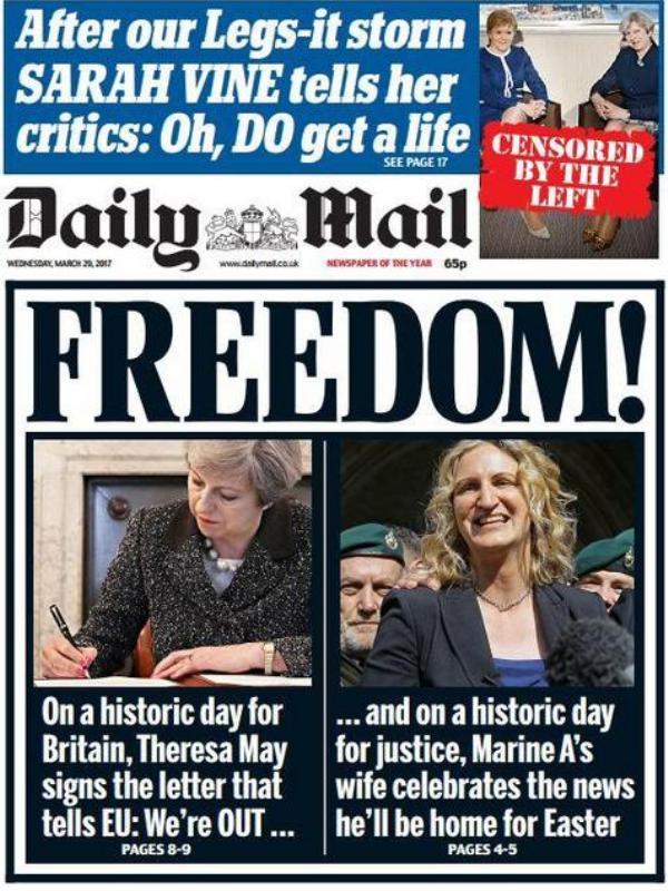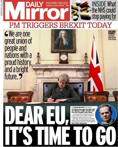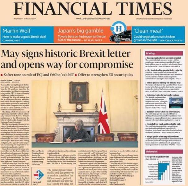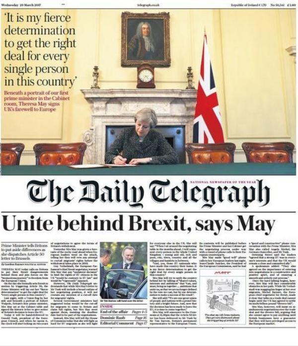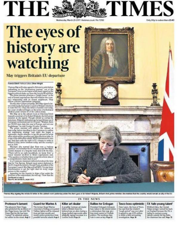 Οι Times λένε «Τα μάτια της Ιστορίας παρακολουθούν», αναφερόμενοι στη φωτογραφία της Τερέζα Μέι που υπογράφει την ιστορική επιστολή κάτω απ’ το πορτρέτο του σερ Ρόμπερτ Γουόλπολ του πρώτου πρωθυπουργού της Βρετανίας