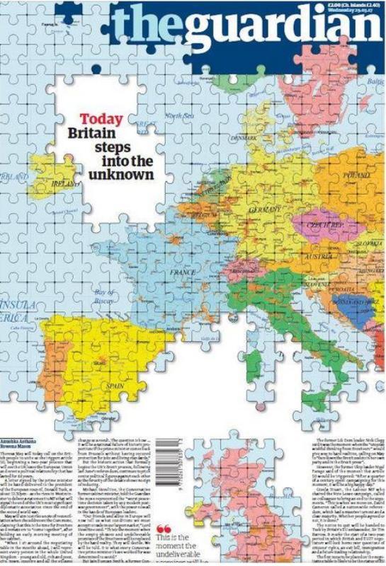 Guardian δείχνει ένα παζλ της ΕΕ μ’ ένα κενό στη θέση της Βρετανίας και τον τίτλο: «Σήμερα η Βρετανία κάνει ένα βήμα στο άγνωστο»