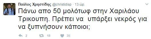 Το ερώτημα «Πρέπει να υπάρξει νεκρός για να ξυπνήσουν κάποιοι;» έθεσε, μέσω το λογαριασμού του στο Twitter, ο εκπρόσωπος Τύπου του ΠΑΣΟΚ, Παύλος Χρηστίδης, αναφερόμενος στην επίθεση με μολότοφ κατά διμοιρίας των ΜΑΤ, αργά το βράδυ της Παρασκευής, στη Χαριλάου Τρικούπη.