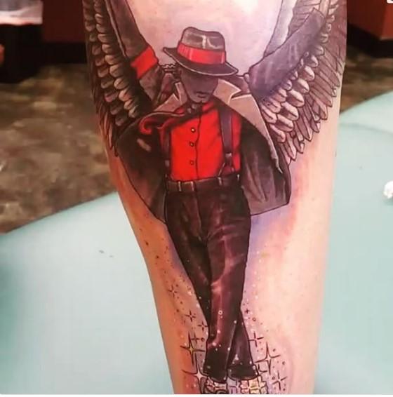 Το τατουάζ, που καλύπτει όλη τη γάμπα του, απεικονίζει τον Μάικλ Τζάκσον σε μία κλασική χορευτική φιγούρα του, ενώ θυμίζει και άγγελο, καθώς έχει και φτερά.