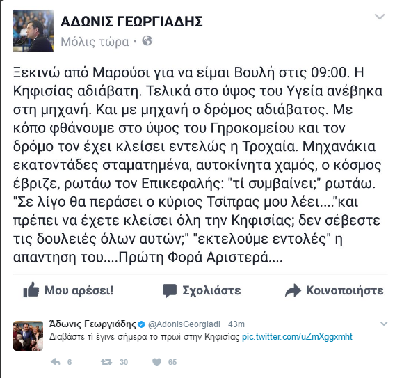 «Ξεκινώ από Μαρούσι για να είμαι Βουλή στις 09:00. Η Κηφισίας αδιάβατη. Τελικά στο ύψος του Υγεία ανέβηκα στη μηχανή. Και με μηχανή ο δρόμος αδιάβατος. Με κόπο φθάνουμε στο ύψος του Γηροκομείου και τον δρόμο τον έχει κλείσει εντελώς η Τροχαία. Μηχανάκια εκατοντάδες σταματημένα, αυτοκίνητα χαμός, ο κόσμος έβριζε, ρωτάω τον Επικεφαλής: “τί συμβαίνει;” ρωτάω. “Σε λίγο θα περάσει ο κύριος Τσίπρας μου λέει….”και πρέπει να έχετε κλείσει όλη την Κηφισίας; δεν σέβεστε τις δουλειές όλων αυτών;” “εκτελούμε εντολές” η απάντηση του….Πρώτη Φορά Αριστερά….», έγραψε στην ανάρτησή του ο Αδωνις Γεωγριάδης.