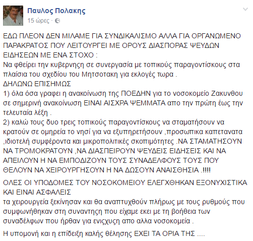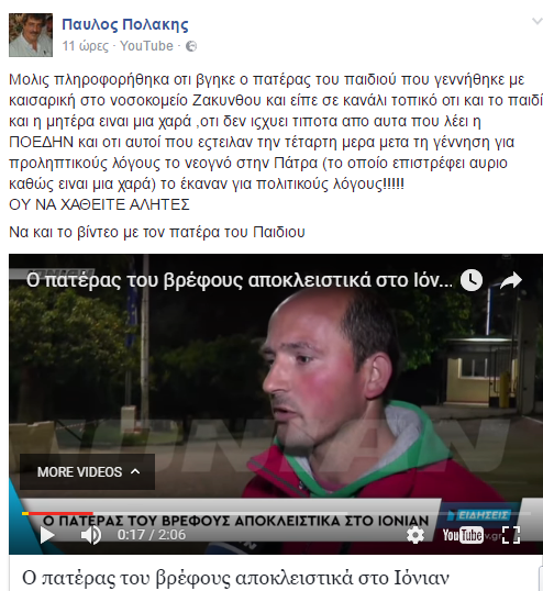 «Μολις πληροφορήθηκα οτι βγηκε ο πατέρας του παιδιού που γεννήθηκε με καισαρική στο νοσοκομείο Ζακυνθου και είπε σε κανάλι τοπικό οτι και το παιδί και η μητέρα ειναι μια χαρά ,οτι δεν ιςχυει τιποτα απο αυτα που λέει η ΠΟΕΔΗΝ και οτι αυτοί που εςτειλαν την τέταρτη μερα μετα τη γέννηση για προληπτικούς λόγους το νεογνό στην Πάτρα (το οποίο επιστρέφει αυριο καθώς ειναι μια χαρά) το έκαναν για πολιτικούς λόγους!!!!!