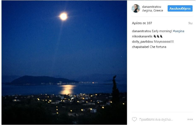 Η Δανάη Στράτου από την Άιγινα όπου βρίσκεται μαζί με τον σύζυγό της, ανέβασε μια φωτογραφία στον προσωπικό της λογαριασμό στο Internet με το ολόγιομο φεγγάρι της «ροζ πανσελήνου».