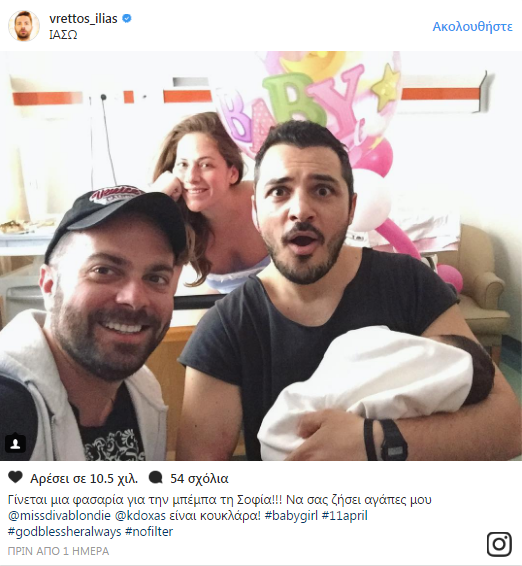 Το γεγονός ανακοίνωσε μέσω Instagram ο Ηλίας Βρεττός, με φωτογραφία που πόσταρε από την επίσκεψή του στο μαιευτήριο και λεζάντα  «Γίνεται μια φασαρία για την μπέμπα τη Σοφία! Να σας ζήσει αγάπες μου».