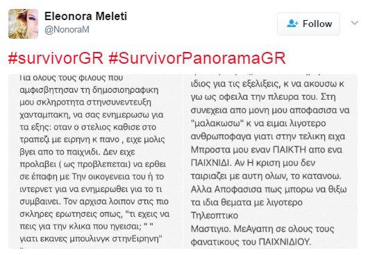 Η Ελεονώρα Μελέτη απάντησε έξαλλη, αλλά και απολογητική για το Survivor Panorama μέσα από το twitter της και φρόντισε λοιπόν λίγο πριν το ταξίδι επιστροφής της στην Ελλάδα να βάλει τα πράγματα στη θέση τους για τον λόγο που υπήρξε τόσο χλιαρή στις ερωτήσεις της!