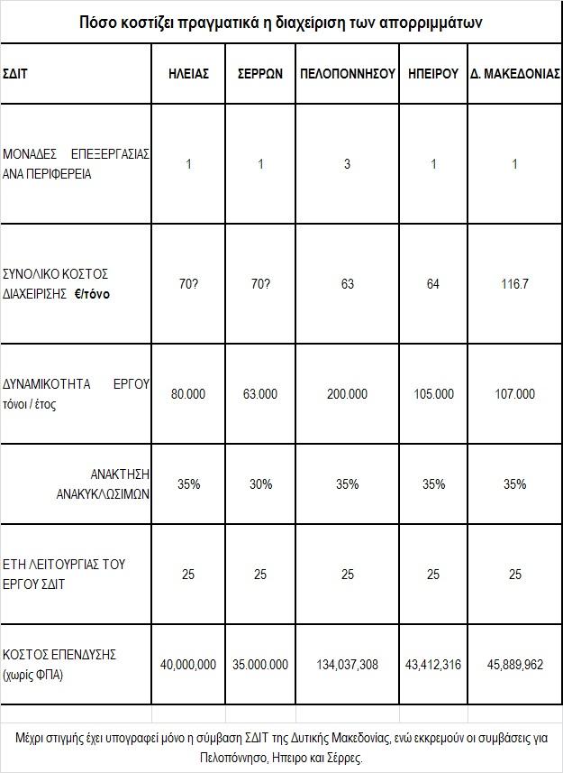 Από τα στοιχεία φαίνεται πως το κόστος επεξεργασίας απορριμμάτων ανά τόνο ξεκινά από τα 63 ευρώ (στην Περιφέρεια Πελοποννήσου) και φτάνει τα 116,7 ευρώ στην Περιφέρεια Δυτικής Μακεδονίας (υψηλό επειδή, μεταξύ άλλων, δεν υπάρχει επιδότηση του κατασκευαστικού κόστους).