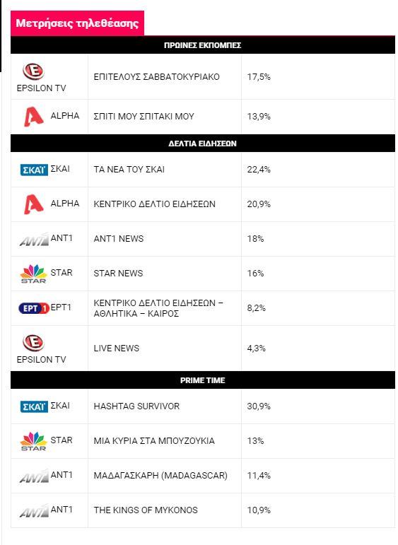 Στο γενικό σύνολο το Survivor έκανε μέσο όρο 30,9% με τη υψηλότερο τέταρτο (21:45-21:59) να φτάνει στο 34,9%.