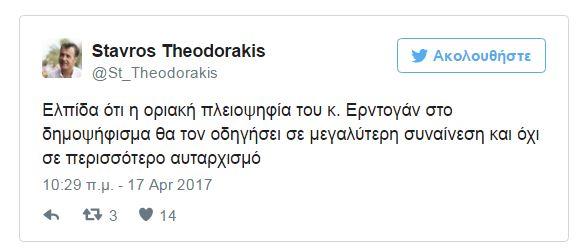 Ο Σταύρος Θεοδωράκης έγραψε: «Ελπίδα ότι η οριακή πλειοψηφία του κ. Ερντογάν στο δημοψήφισμα θα τον οδηγήσει σε μεγαλύτερη συναίνεση και όχι σε περισσότερο αυταρχισμό».