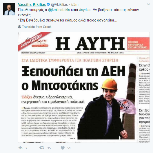 «Ξεπουλάει τη ΔΕΗ ο Μητσοτάκης», και σχολίασε: «Πρωθυπουργός ο Μητσοτάκης κατά ΣΥΡΙΖΑ. Αν βιάζονται τόσο ας κάνουν εκλογές» έγραφε ο Βασίλης Κικίλιας και πρόσθεσε υποσημείωση πως «στη Βενεζουέλα σκοτώνεται κόσμος αλλά ποιος ασχολείται…».