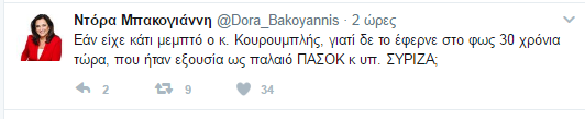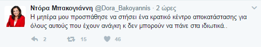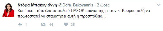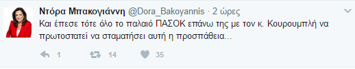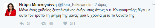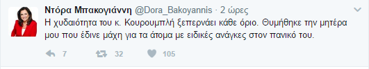 «Η χυδαιότητα του κ. Κουρουμπλή ξεπερνάει κάθε όριο. Θυμήθηκε την μητέρα μου που έδινε μάχη για τα άτομα με ειδικές ανάγκες στον πανικό του» έγραψε η Ντότα Μπακογιάννη και συμπλήρωσε: «Μόνο ένας χυδαίος, ξεφτιλισμένος άνθρωπος όπως ο κ. Κουρουμπλής θίγει με αυτό τον τρόπο τη μνήμη της μάνας μου 5 χρόνια μετά το θάνατό της».