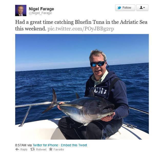 Αντιδράσεις έχει προκαλέσει στην Ιταλία η ανάρτηση φωτογραφίας στο Facebook του βρετανού ευρωσκεπτικιστή πολιτικού, Νάιτζελ Φάρατζ, στην οποία φαίνεται να κρατά έναν κόκκινο τόνο που μόλις έχει ψαρέψει. Ο βρετανός πολιτικός, πολέμιος της ΕΕ και υπέρμαχος του Brexit, ανήρτησε τη φωτογραφία αυτή στη διάρκεια ψαρέματος στην Αδριατική το προηγούμενο Σαββατοκύριακο. Ιδιαίτερα ενοχλημένος όμως ο ιταλικός Τύπος τον κατηγορεί ότι προφανώς έχει παραπλανηθεί από τις συνέπειες του Brexit και αγνοεί την εγκυρότητα των κανόνων της ΕΕ σύμφωνα με τους οποίους απαγορεύεται την περίοδο αυτή η αλιεία τόνου.