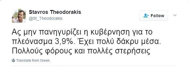 Από την πλευρά του, ο Σταύρος Θεοδωράκης επέλεξε το Twitter για να επιτεθεί στην κυβέρνηση, σχολιάζοντας: «Ας μην πανηγυρίζει η κυβέρνηση για το πλεόνασμα 3,9%. Έχει πολύ δάκρυ μέσα. Πολλούς φόρους και πολλές στερήσεις».