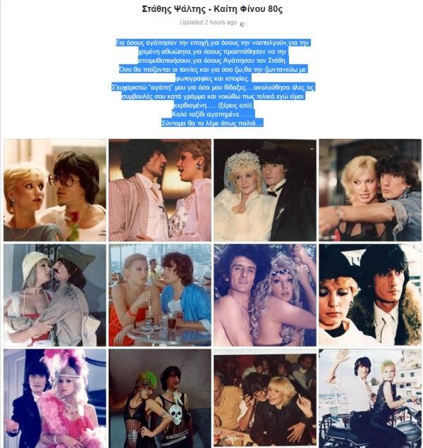 Με ένα άλμπουμ 50 φωτογραφιών, από την εποχή που ο Στάθης Ψάλτης και η Καίτη Φίνου έλαμπαν στη δεκαετία του ’80, και ένα συγκινητικό σχόλιο, λέει ύστατο «αντίο» στον αγαπημένο κωμικό η γνωστή ηθοποιός.