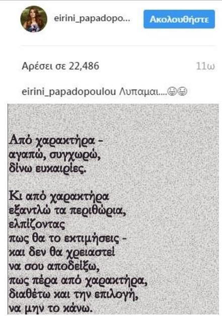 Παράλληλα, ανέβασε μια νέα φωτογραφία με αινιγματικό κείμενο, για το οποίο έγραψε: «Λυπάμαι..».