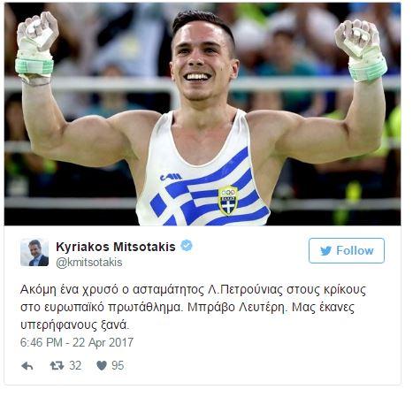 Ο Κυριάκος Μητσοτάκης ανέφερε χαρακτηριστικα΄: “Ακόμα ένα χρυσό ο ασταμάτητος Λ. Πετρούνιας στους κρίκους στο ευρωπαϊκό πρωτάθλημα. Μπράβο Λευτέρη. Μας έκανες περήφανους ξανά”.