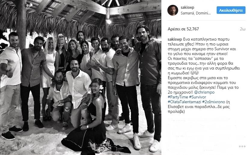 «Ένα καταπληκτικό πάρτι τελείωσε χθες! Ήταν η πιο ωραία στιγμή μέχρι σήμερα στο Survivor και το γέλιο που κάναμε ήταν επικό! Οι παίκτες τα “έσπασαν” με τα τραγούδια τους. Tην άλλη φορά θα σας πω κι εγώ ένα για να συμπληρωθεί η κωμωδία! Είμαστε ακριβώς στα μισά και το πραγματικά ενδιαφέρον κομμάτι του παιχνιδιού μόλις ξεκίνησε! Πάμε για το 2ο ημίχρονο!! (η Ελισάβετ είναι παραδίπλα…δε μας πρόλαβε)».
