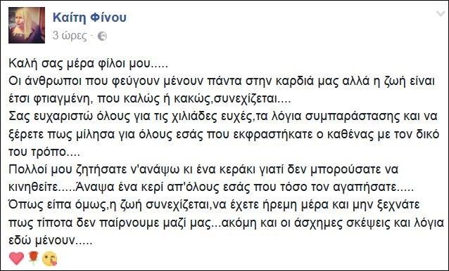 Διαδικτυακό «ευχαριστώ» έστειλε η Καίτη Φίνου στους εκατοντάδες φίλους της στο Facebook για την συμπαράσταση τους στις δύσκολες στιγμές που πέρασε με τον θάνατο τουΣτάθη Ψάλτη.