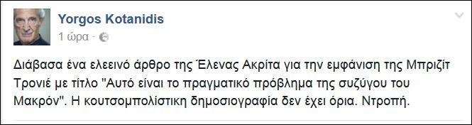 Σε πολύ έντονο ύφος, ο Γιώργος Κοτανίδης έγραψε στο Facebook: «Διάβασα ένα ελεεινό άρθρο της Έλενας Ακρίτα για την εμφάνιση της Μπριζίτ Τρονιέ με τίτλο “Αυτό είναι το πραγματικό πρόβλημα της συζύγου του Μακρόν”. Η κουτσομπολίστικη δημοσιογραφία δεν έχει όρια. Ντροπή».