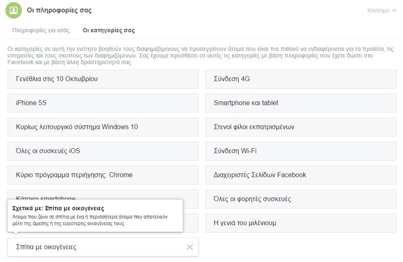 Κάνοντας κλικ εδώ και επιλέγοντας διαδοχικά “Οι πληροφορίες σας” και “Οι κατηγορίες σας”, θα βρείτε το διαφημιστικό σας προφίλ στην πλατφόρμα. Οι πληροφορίες ίσως εκ πρώτης όψεως δεν είναι πολλές. Αν δοκιμάσετε όμως να μετακινήσετε τον κέρσορα του ποντικιού σε κάποια από τις σχετικές κατηγορίες, θα διαπιστώσετε ότι το Facebook σας έχει… ψυχολογήσει για τα καλά!