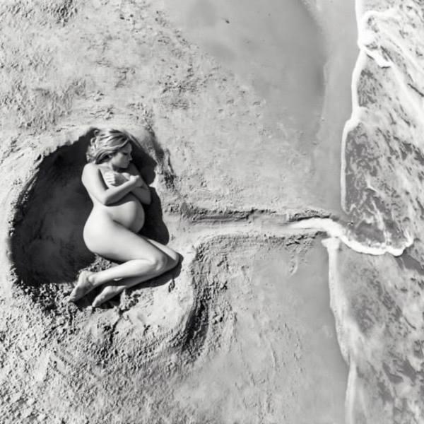 Αυτο που κάνει τη φωτογραφία εξαιρετική είναι ότι χάρη σε ένα ευρηματικό σκάψιμο και την εμπνευσμένη στάση του σώματος της, εμφανίζεται σαν να ειναι η ίδια έμβρυο στον αμνιακό σάκο, με τον ομφάλιο λώρο να απλώνεται στην ακροθαλασσιά μπροστά της.