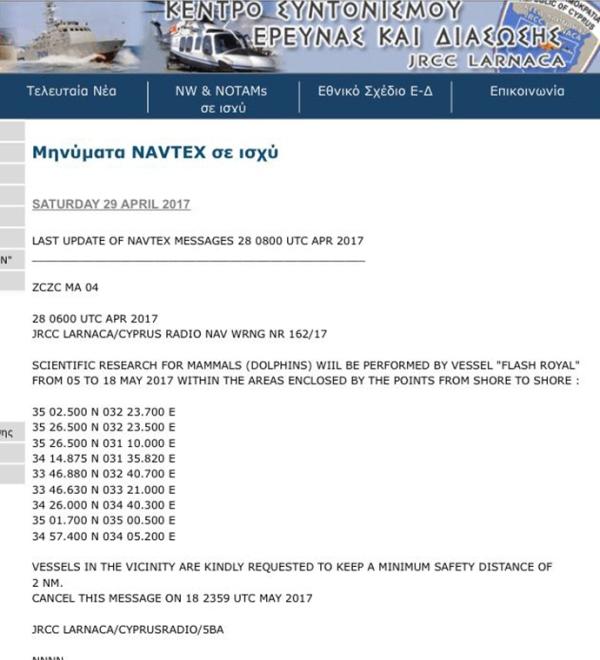 Οι αρμόδιες Κυπριακές αρχές από τον Σταθμό της Λάρνακας (JRCC LARNACA/CYPRUS RADIO) εξέδωσαν την NAVTEX 162/17 με την οποία ανακοίνωναν ότι από τις 5 μέχρι τις 18 Μαΐου το σκάφος Flash Royal θα πραγματοποιήσει σε μια εκτεταμένη περιοχή που βρίσκεται εντός της Κυπριακής ΑΟΖ αλλά και του χώρου κυπριακής ευθύνης για έκδοση NAVTEX, επιστημονικές έρευνες για θηλαστικά (δελφίνια).
