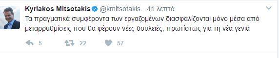 «Τα πραγματικά συμφέροντα των εργαζομένων διασφαλίζονται μόνο μέσα από μεταρρυθμίσεις που θα φέρουν νέες δουλειές, πρωτίστως για τη νέα γενιά», έγραψε ο πρόεδρος της ΝΔ.