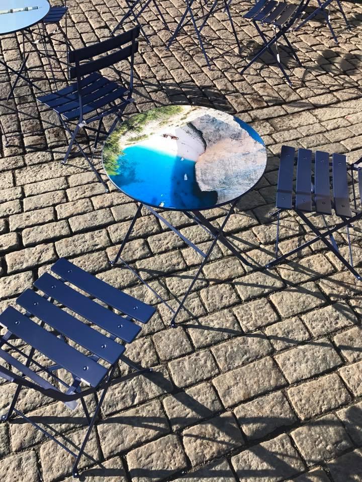 Πάνω στα γαλάζια τραπεζάκια, είναι αποτυπωμένα τοπία και στιγμιότυπα από την παράδοση του τόπου μας ενώ σερβίρονται σουβλάκι και μαγειρευτά υπό τους ήχους παλιάς ελληνικής μουσικής.