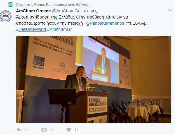 Μήνυμα προς την Τουρκία έστειλε ο υπουργός Εθνικής Άμυνας Πάνος Καμμένος από το Συνέδριο για την Άμυνα και την Ασφάλεια ”Exposec-Defenseworld conference”.  Όπως τόνισε ο ΥΕΘΑ η αντίδραση της Ελλάδας είναι ”άμεση όσον αφορά στην πρόθεση κάποιων να αποσταθεροποιήσουν την περιοχή”, ενώ παράλληλα είπε ότι ”η στενή συνεργασία με τις ΗΠΑ διασφαλίζει τα συμφέροντα της ευρύτερης περιοχής της Ελλάδας και προάγει τη σταθερότητα”.