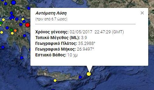 Σύμφωνα με το Γεωδυναμικό Ινστιτούτο του Εθνικού Αστεροσκοπείου Αθηνών ασθενής σεισμική δόνηση, εντάσεως 3,9 βαθμών της κλίμακας Ρίχτερ σημειώθηκε τα ξημερώματα της Τετάρτης στη θαλάσσια περιοχή ανατολικά της Κρήτης