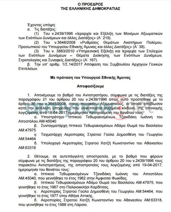 Πιο συγκεκριμένα, οι θανόντες αξιωματικοί προάγονται στον βαθμό του αντιστρατήγου, με το αιτιολογικό ότι “Απεβίωσαν Κατά την Εκτέλεση Υπηρεσίας Αυξηµένου Κινδύνου”.