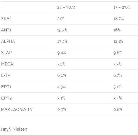 Ο ΑΝΤ1 είναι το μόνο κανάλι που καταφέρνει να ακολουθεί τον ΣΚΑΪ, αλλά κι αυτός την περασμένη εβδομάδα έπεσε στο 15,3%.