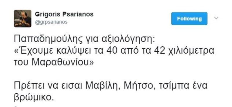 Με ένα χιουμοριστικό tweet απάντησε ο Γρηγόρης Ψαριανός στον ευρωβουλευτή του ΣΥΡΙΖΑ και αντιπρόεδρο του ευρωκοινοβουλίου Δημήτρη Παπαδημούλη.