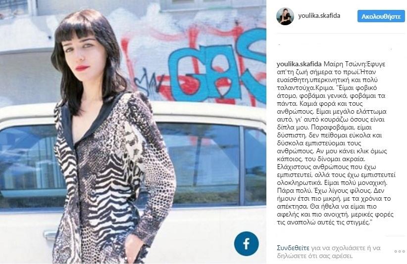Συγκεκριμένα, η Γιούλικα Σκαφιδά ανέβασε στο Instagram της μια φωτογραφία της Μαίρης Τσώνη και έγραψε: