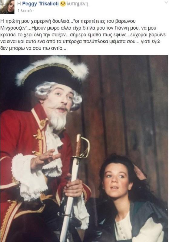 «Η πρώτη μου χειμερινή δουλειά…”Οι περιπέτειες του βαρώνου Μινχαουζεν”…Ήμουν μωρό αλλά είχα δίπλα μου τον Γιάννη μου, να μου κρατάει το χέρι όλη την σαιζόν…σήμερα έμαθα πως έφυγε…εύχομαι βαρώνε να είναι και αυτό ένα από τα υπέροχα πολύπλοκα ψέματα σου… γιατί εγώ δεν μπορώ να σου πω αντίο…».
