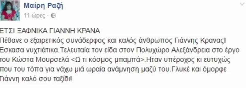 «ΕΤΣΙ ΞΑΦΝΙΚΑ ΓΙΑΝΝΗ ΚΡΑΝΑ. Πέθανε ο εξαιρετικός συνάδελφος και καλός άνθρωπος Γιάννης Κρανάς! Έσκασα νυχτιάτικα. Τελευταία τον είδα στον Πολυχώρο Αλεξάνδρεια στο έργο του Κώστα Μουρσελά “Ω τι κόσμος μπαμπά”. Ήταν υπέροχος κι ευτυχώς που του το ‘πα για να ‘χω μια ωραία ανάμνηση μαζί του. Γλυκέ και όμορφε Γιάννη, καλό σου ταξίδι!» έγραψε χαρακτηριστικά.