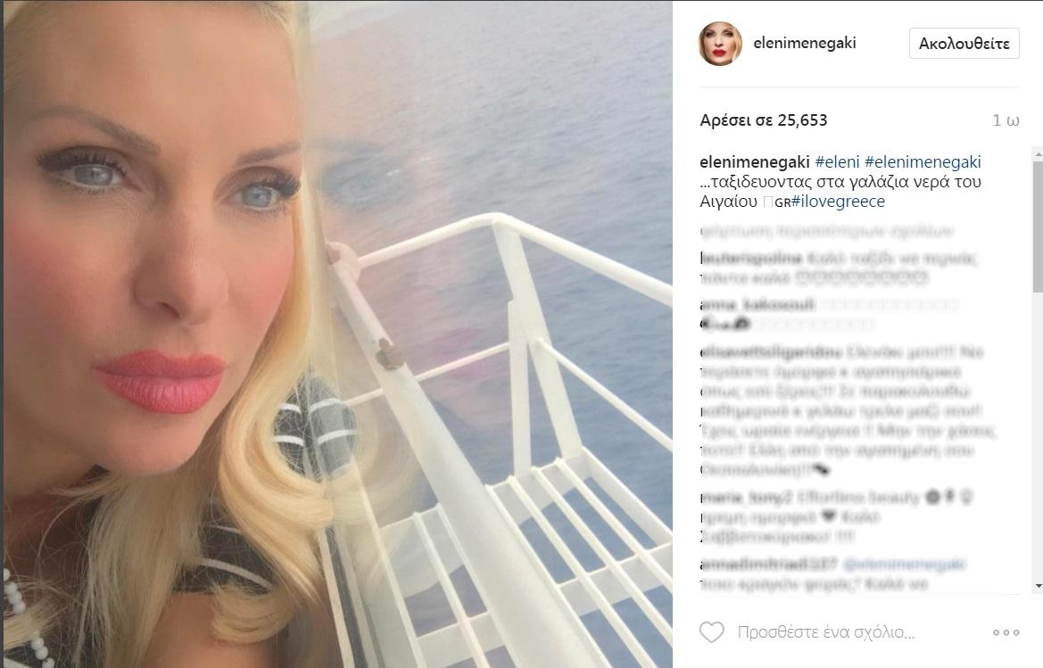 «…ταξιδεύοντας στα γαλάζια νερά του Αιγαίου» έγραψε η παρουσιάστρια κοιτάζοντας έξω από το παράθυρο τα νερά που είχαν το ίδιο χρώμα με τα μάτια της. Οι followers της «απάντησαν» με πολλές καρδούλες, αλλά και ευχές για ένα όμορφο Σαββατοκύριακο μακριά από την Αθήνα.